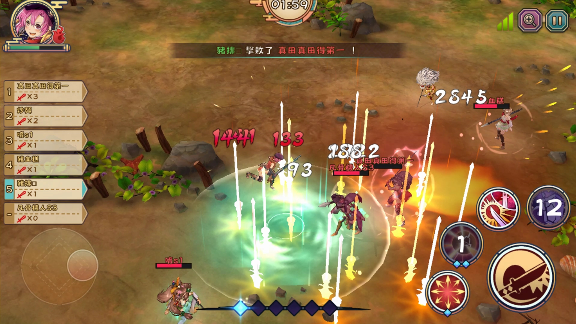 每當滿6人後即可開啟戰場,在地圖中互相廝殺三分鐘!大亂鬥戰鬥時無屬性相剋的設定以確保各職業平衡戰鬥,時間終止後以擊殺數來計算排名分數。